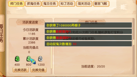 - 🌈 锦衣和足迹这些有属性,加2万血一定要第一时间攒资源购买,这里推荐买个VIP,每天可以领资源,还送月卡,前期起步轻松很多,每天额外送2次抽奖,每天400次静态抓鬼,原地不动直接获得奖励(可以组队,也可以打其他怪,必须是队长)