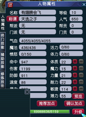 - 🌈 加入门派以后,先学技能,因为升级需要有4项师门技能不小于人物等级10级,升到69级停下来,补上群秒技能和有附加属性的其他师门技能等级(本服师门技能不限制先学门派基础技能),加点直接点推荐加点就可以了,不建议加体质,基本上不缺血。然后用飞行符去长安城国境驿站旁边找罗道人买飞行棋(因为商城卖的贵一点)